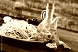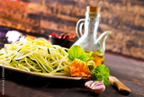Raw zucchini noodles on plate. Zucchini spaghetti in metal bowl.