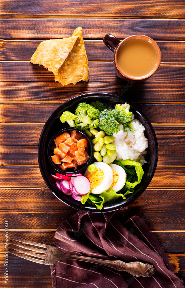 Rice with red fish, green beans and broccoli in a black plate. Diet.