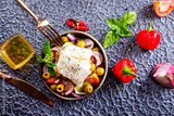 Greek salad of fresh juicy vegetables, feta cheese, herbs and olives