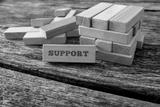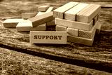 Wooden block with Support word leaning on a structure made of ma