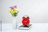 Chrysanthemums in vases with alarm clock on a book on white background.