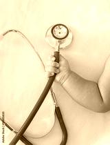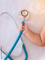 medical instruments stethoscope in hand of newborn baby girl
