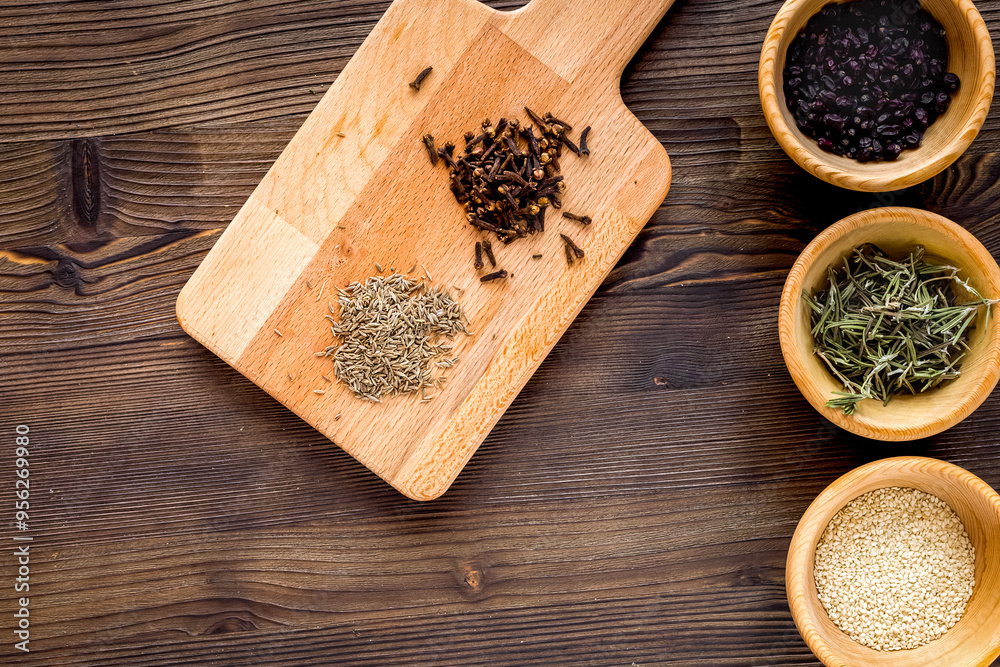 Cooking with spices, salt and pepper on kitchen table background top view