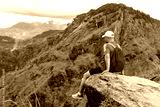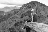 middle-aged man with a backpack went hiking and admires picturesque and epic View from the Small Adam Peak Mountain in Sri Lanka