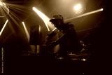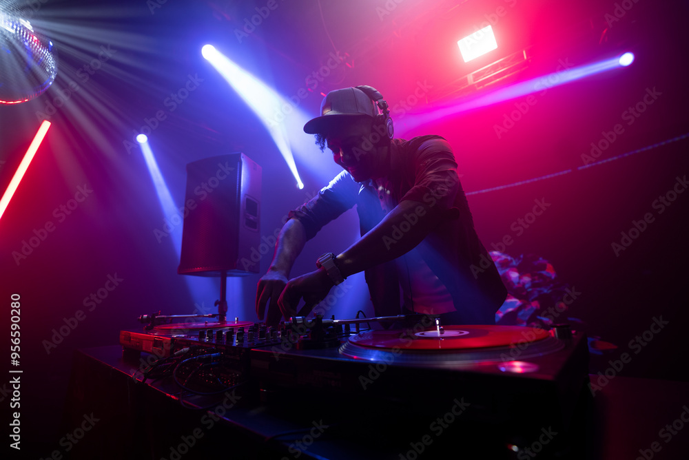 Top view of a DJ works in the club on the equipment, dancing and shaking his body