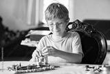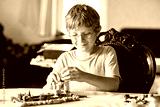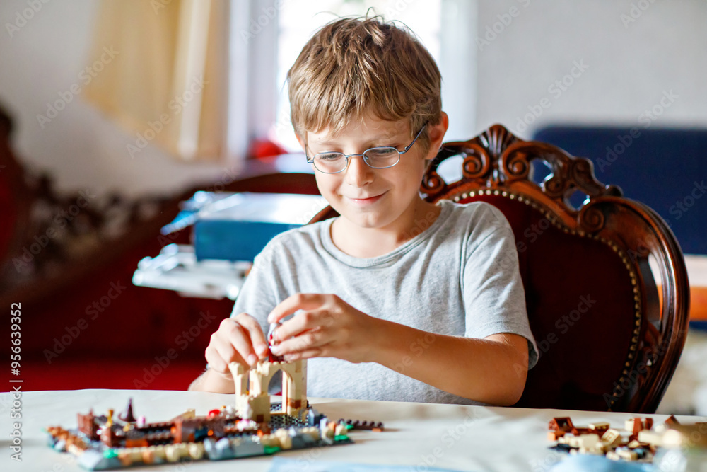 Little preschool or elementary school kid boy building a plastic blocks set at a table, focused and engaged in the activity. The scene is indoors, with a casual and warm atmosphere. Happy child.
