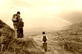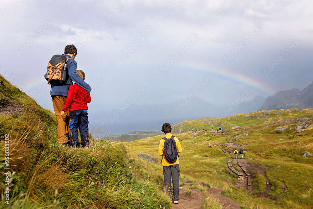 Happy children with parents and dog, european family, hiking the Kvalvika trail on hill at Kvalvika beach, Norway