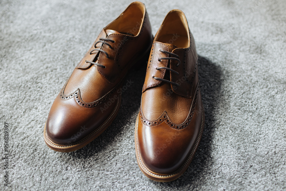 Brown leather shoes. Groom getting ready for the wedding. Wearing clothes dressing up. Man fashion background. Gray fluffy carpet clothing detail. Footwear object isolated on floor.