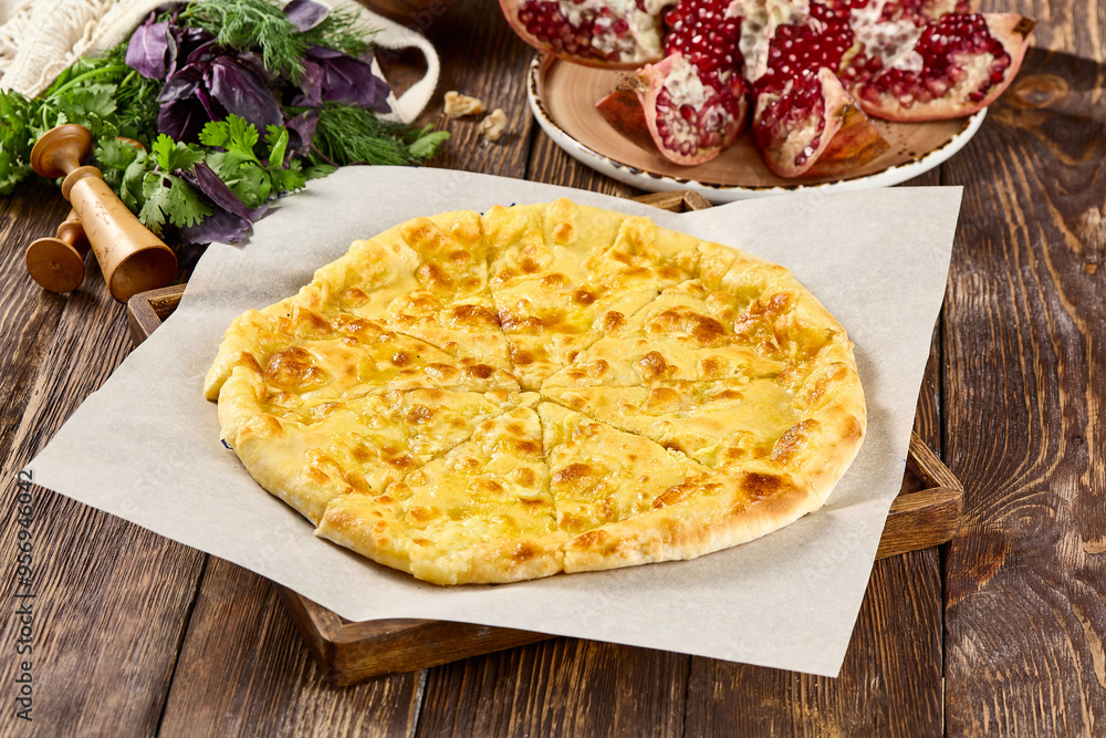 Traditional Ossetian Cheese Pie on Wooden Table with Herbs and Pomegranates