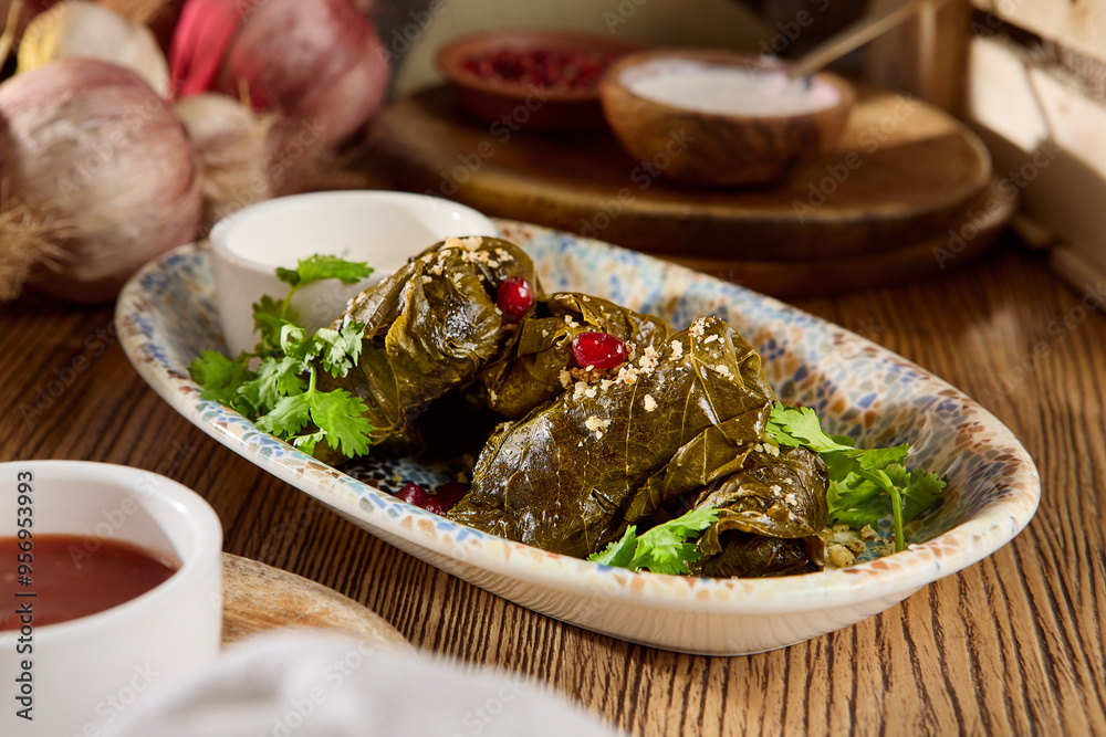 Dolma Wrapped in Grape Leaves with Garnish and Sauces on a Rustic Table