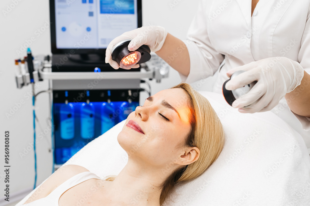 A woman undergoes LED light therapy, a non-invasive facial treatment to rejuvenate and enhance skin texture. Perfect for showcasing advanced skincare solutions for a youthful glow.
