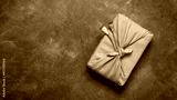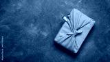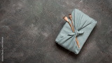 Autumn present wrapped in fabric on a dark background. Furoshiki gifts in eco friendly reusable fabric package. Zero waste concept. Top view, flat lay.