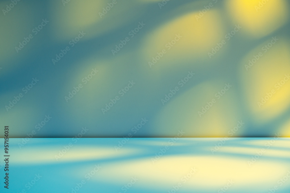 Abstract light blue background for product presentation. Light and shadow on plaster wall.