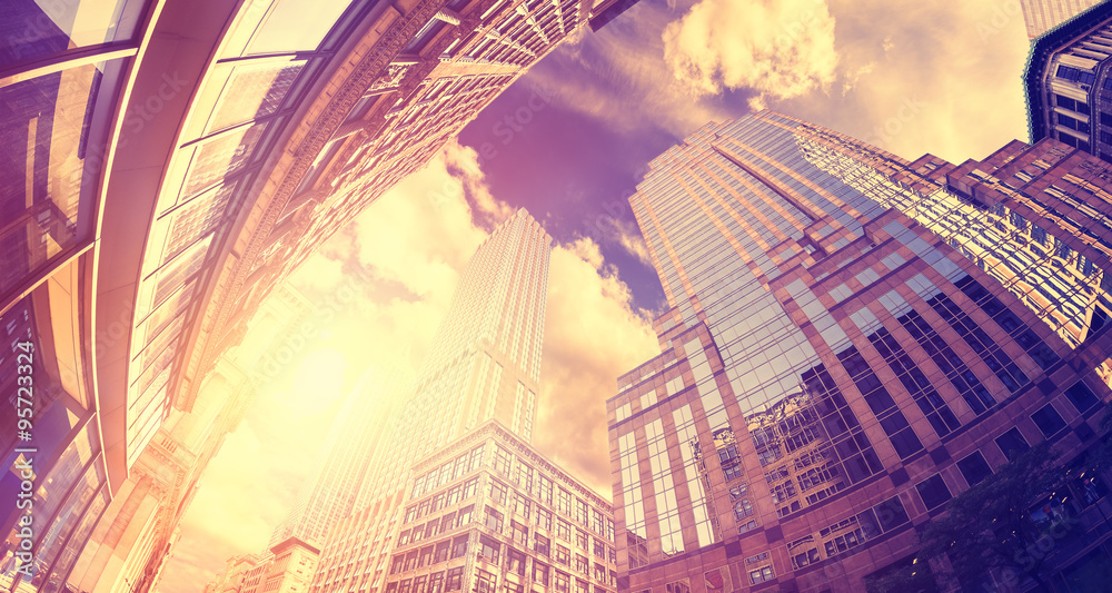 Vintage toned fisheye lens photo of skyscrapers in Manhattan at sunset.