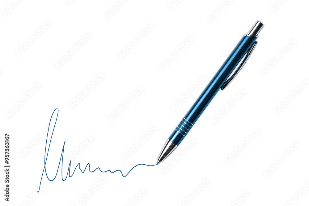 Blue metal pen isolated on white. Single object cutout. Office utilities background. Empty copy space signing business deal background. Hand signature. Contract confirmation symbol.