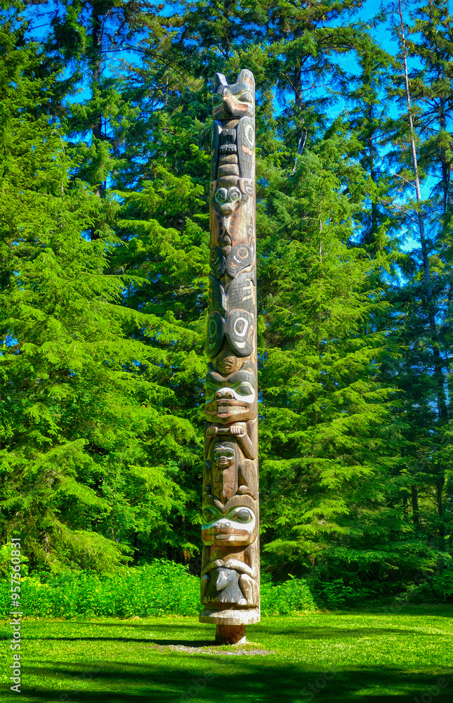 Traditional totem pole standing in forest on sunny day