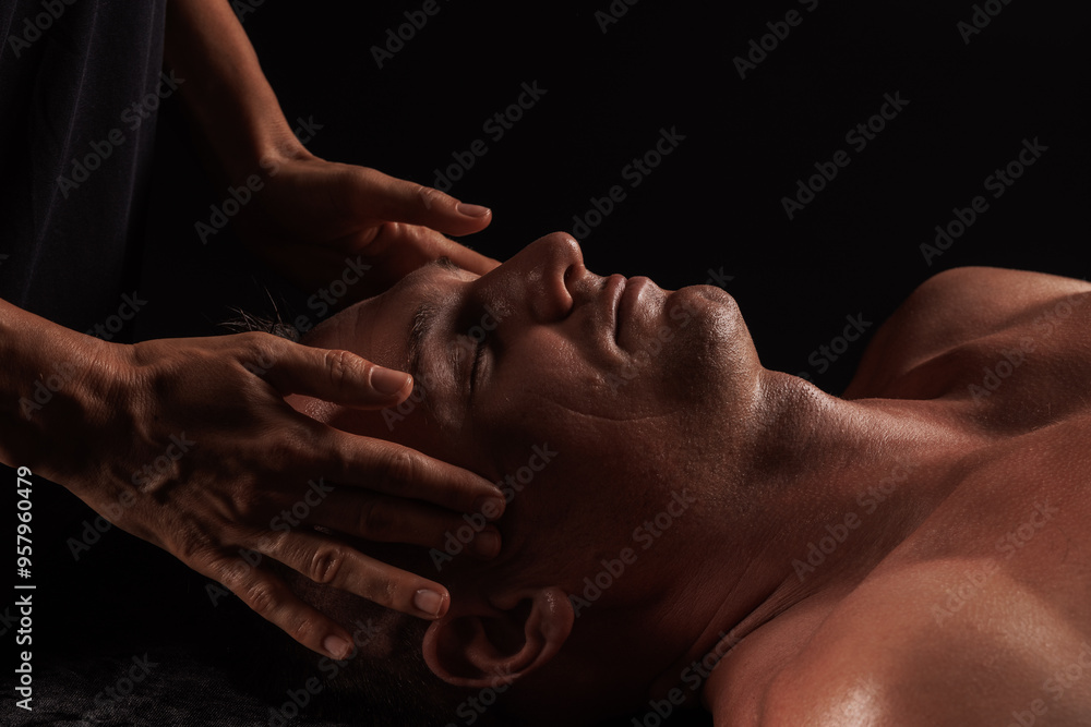 Close-up of a man receiving a facial massage against a dark background, The hands of the massage therapist are gently pressing on his forehead and temples.