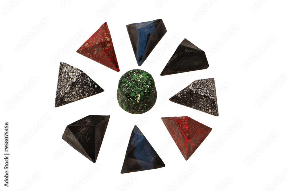 Chocolate candies in the form of precious stones, with marble texture, isolated on a white background.