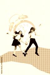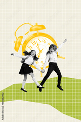 Vertical photo collage of two happy schoolgirl boy walk together time back school study concept schedule isolated on painted background