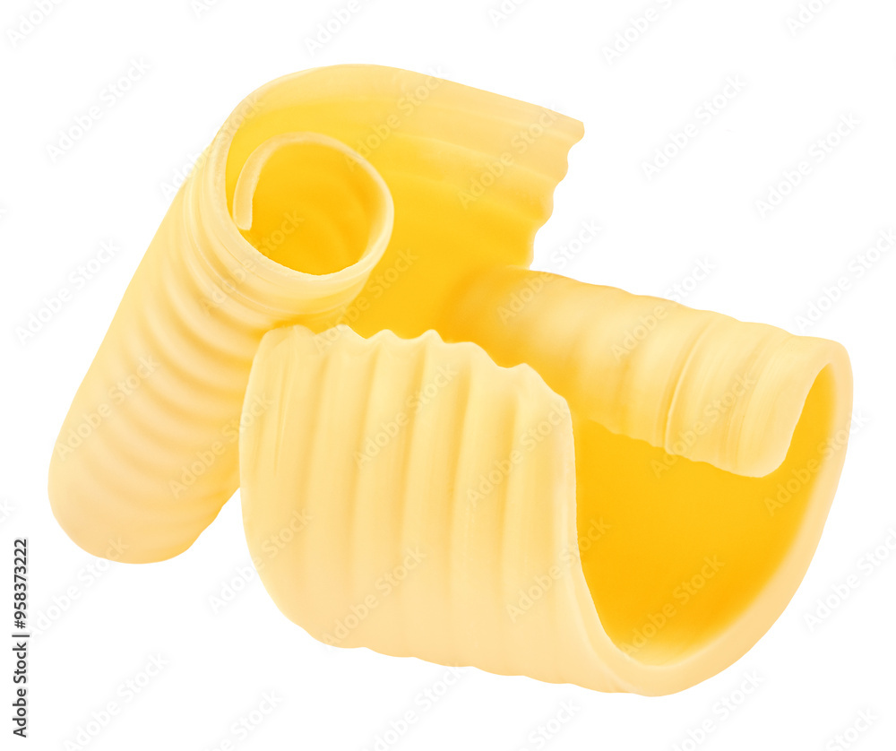 Butter curl rolled up isolated on white background. Fresh butter piece, twisted. Diary product