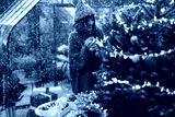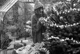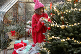 Young woman in red decorates lush Christmas tree with festive ballls and garland at backyard of her house on snow fall, preparing for a winter holidays