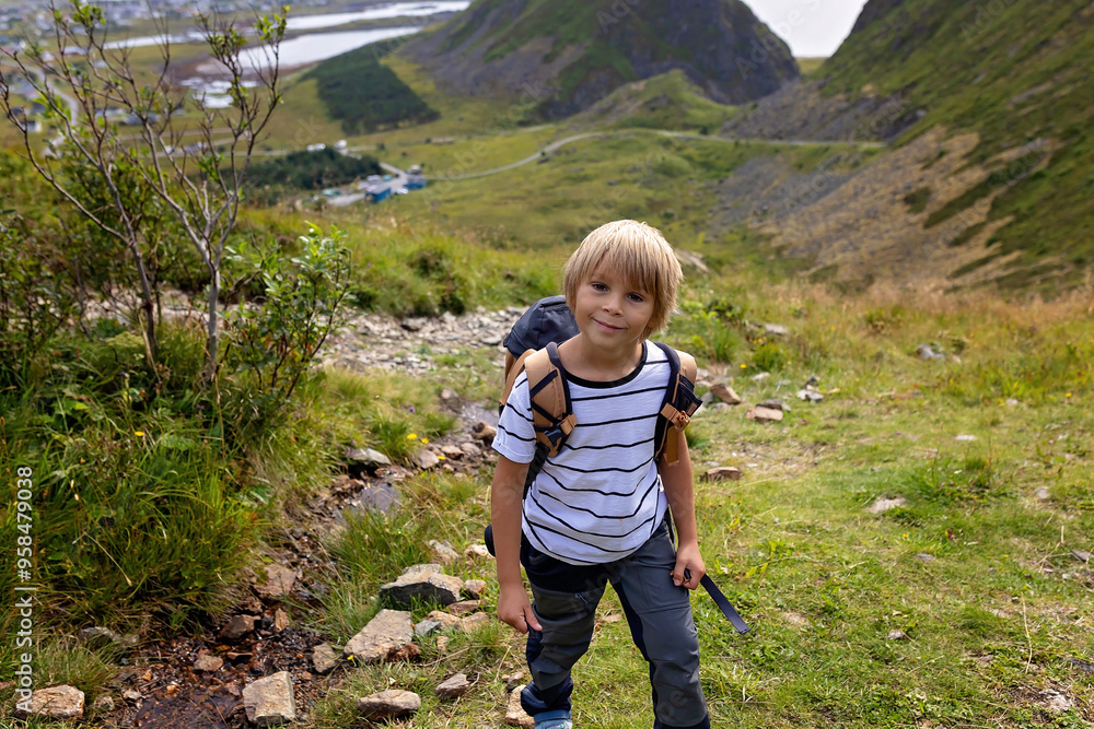 Family with kids and dog, hiking in Vaeroya island, the most famous hike Haen, children enjoying hiking on a sunny day