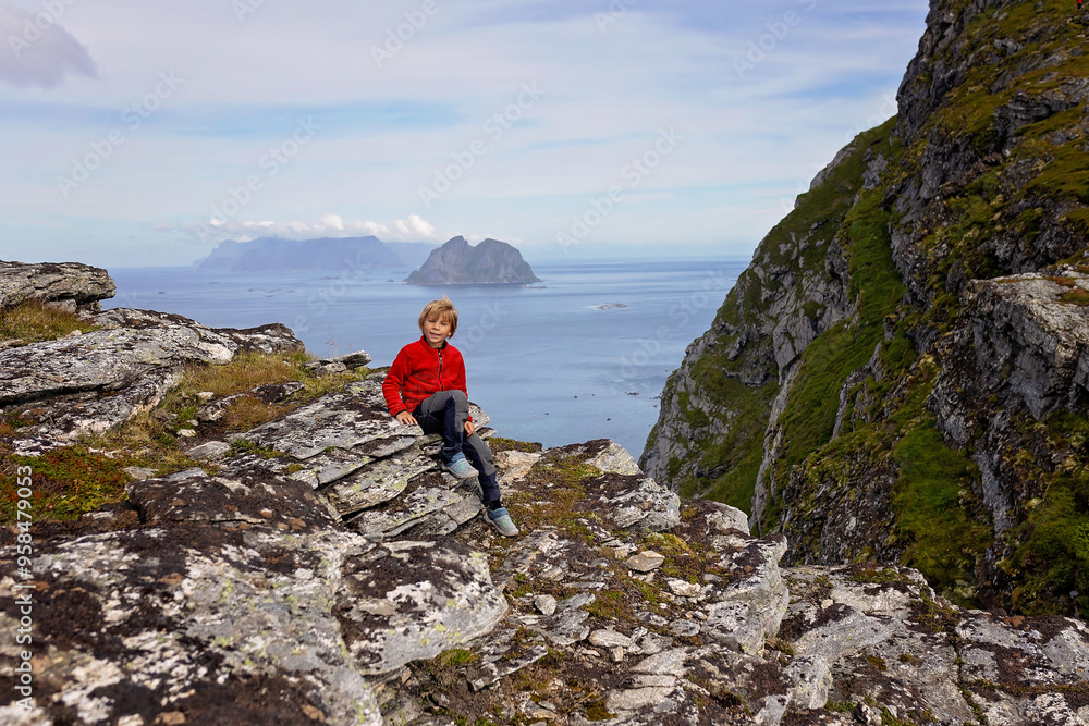Family with kids and dog, hiking in Vaeroya island, the most famous hike Haen, children enjoying hiking on a sunny day