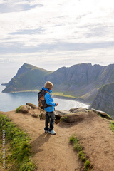 Family with kids and dog, hiking in Vaeroya island, the most famous hike Haen, children enjoying hiking on a sunny day