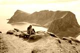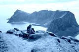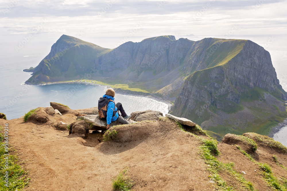 Family with kids and dog, hiking in Vaeroya island, the most famous hike Haen, children enjoying hiking on a sunny day