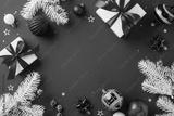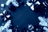 Elegant Christmas scene featuring beautifully wrapped gifts, ornaments, and white pine branches on a blue background. Perfect for holiday celebrations, festive greetings, and seasonal decor