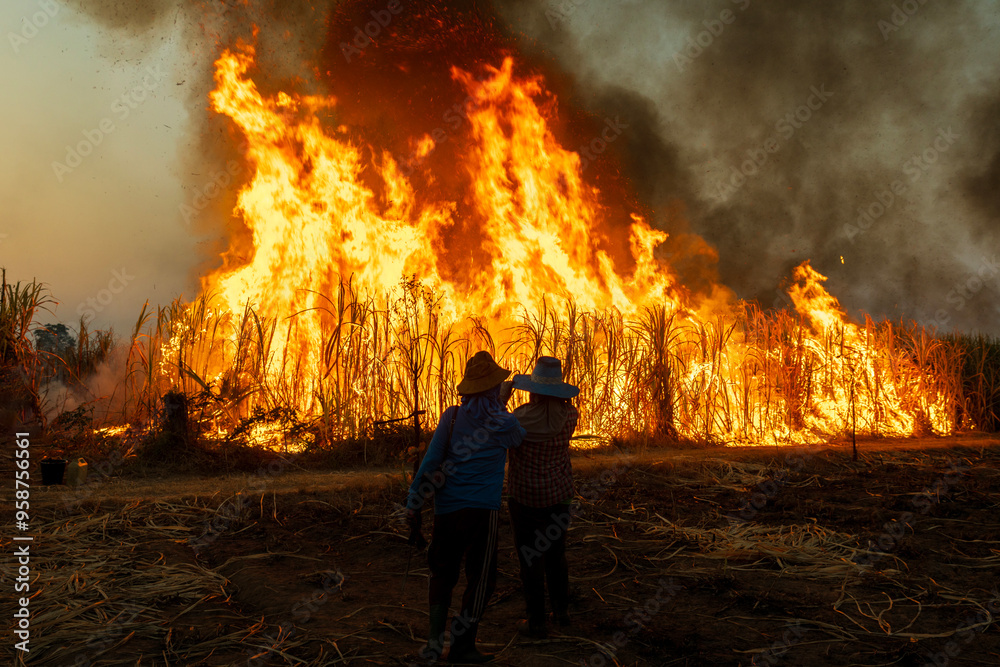 Back view of Asian worker burning sugarcane field at night to harvest and send to factories, environment concept.