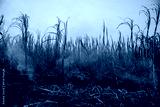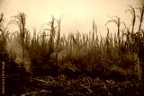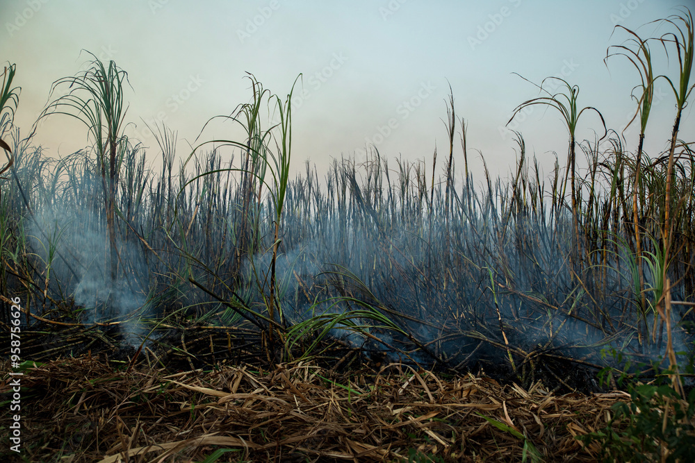 Sugarcane fields are burned and smoke before workers harvest and send to sugar factories in Thailand.