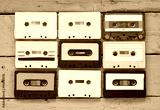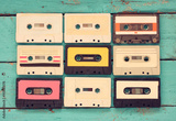 close up photo of vintage cassette tape over aqua wooden table . top view. retro filtered