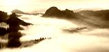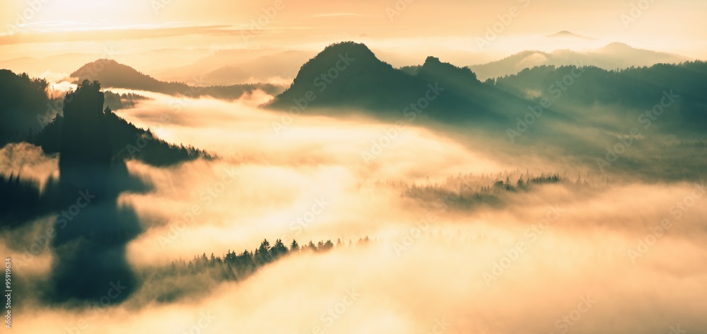 Autumn sunset view over forest to fall colorful valley full of dense mist colored with hot sun rays