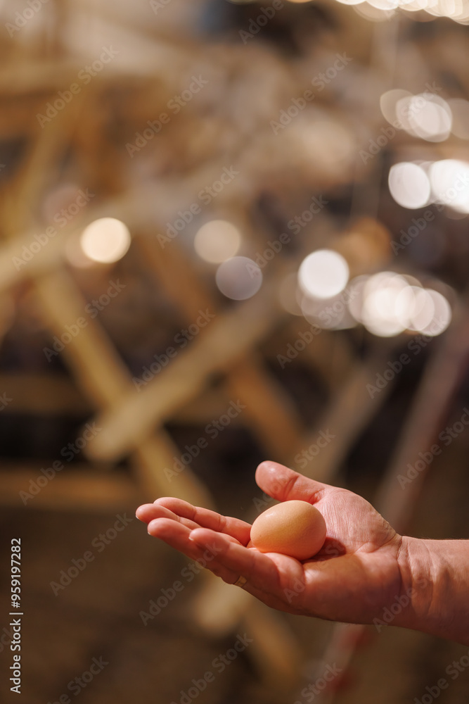 A close-up of a hand holding a single egg, with a blurred background of a poultry farm filled with chickens and equipment. The lighting is warm and highlights the egg.