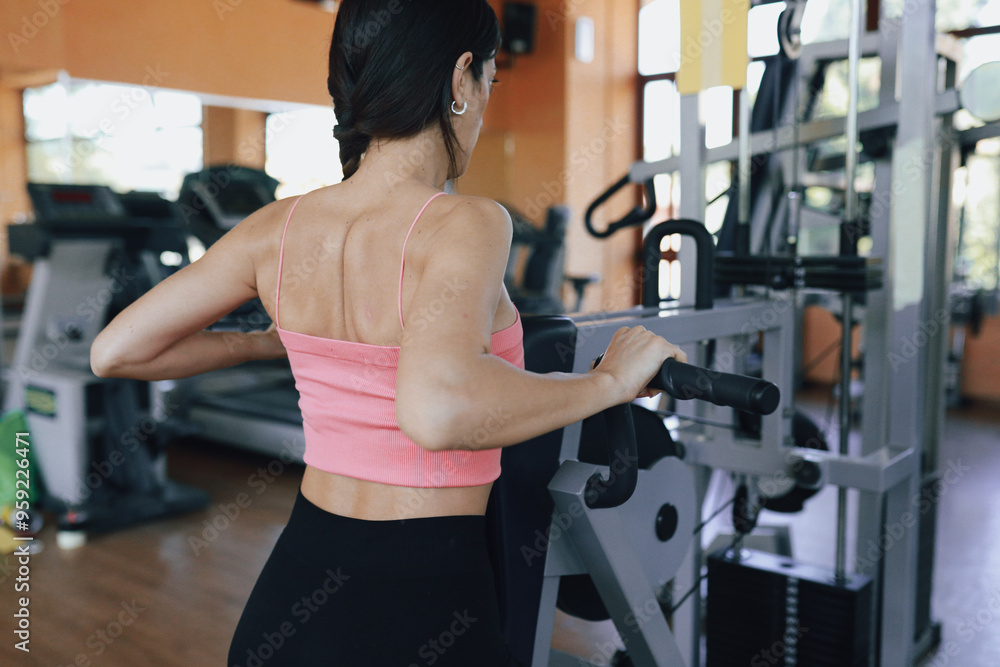 Woman Seen From Behind While Training On The Rowing Machine
