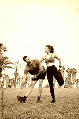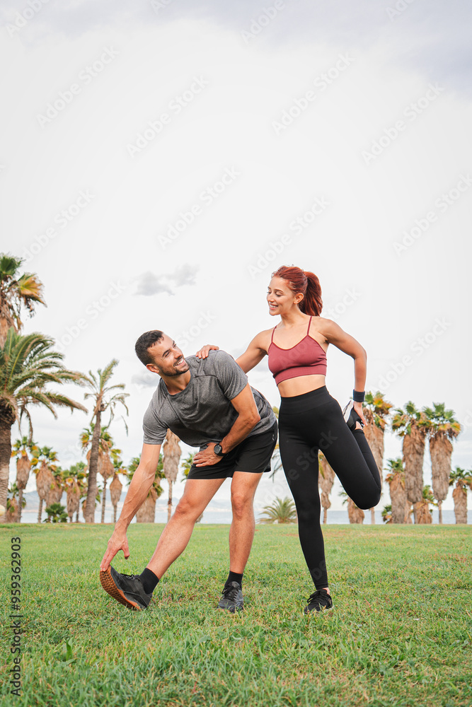 Vertical athletic couple stretching their muscles with yoga poses after a fitness workout on the coast. Two sporty people enjoying an outdoor Pilates session to improve their health and flexibility