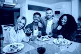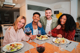 Portrait of a group of multiracial young friends having a lunch and eating together, enjoying a salad. Two multiethnic couples looking at the camera while having a healthy vegetarian dinner at home.
