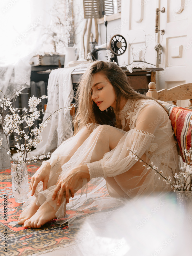 Young caucasian fashionable girl wearing stylish bridal dress sitting on chair, posing at home in vintage interior