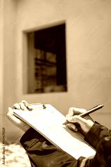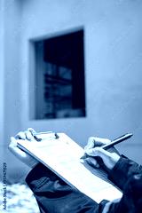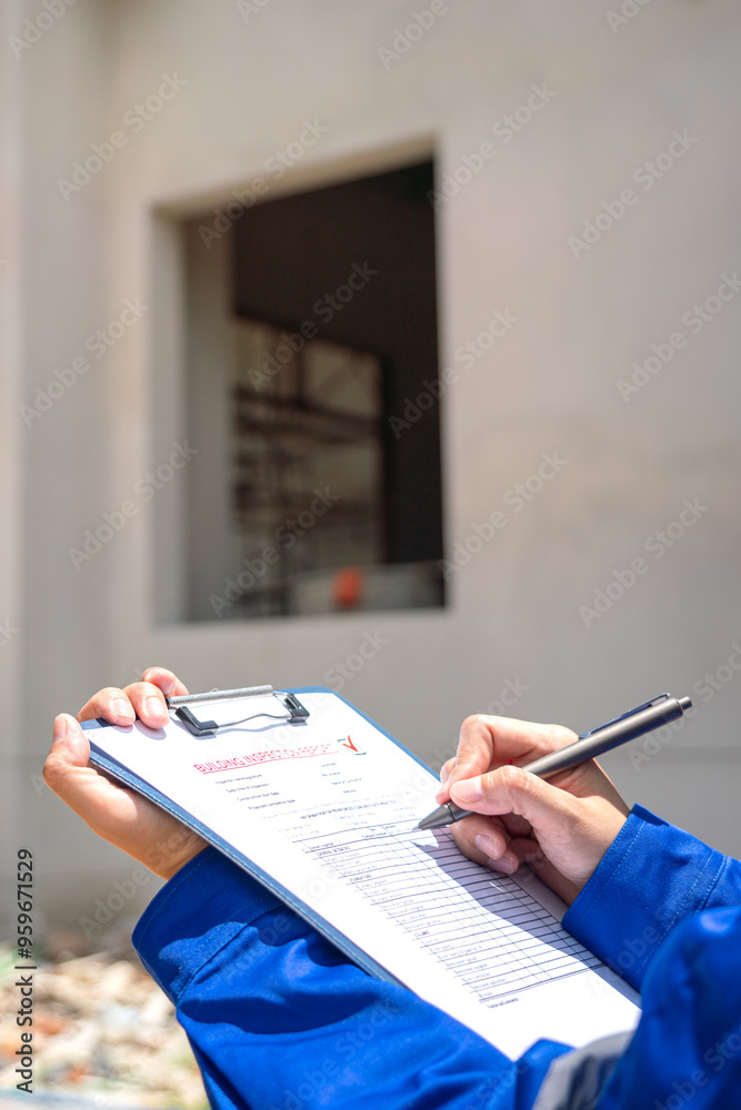 An architect is checking on house building quality checklist form to inspecting the progress with building house as blurred background. Construction industrial working scene, close-up.