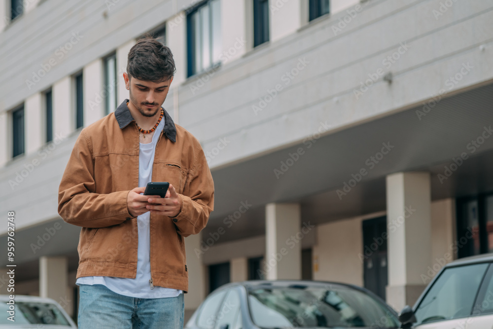 Casual young man walking through the city while looking at mobile phone