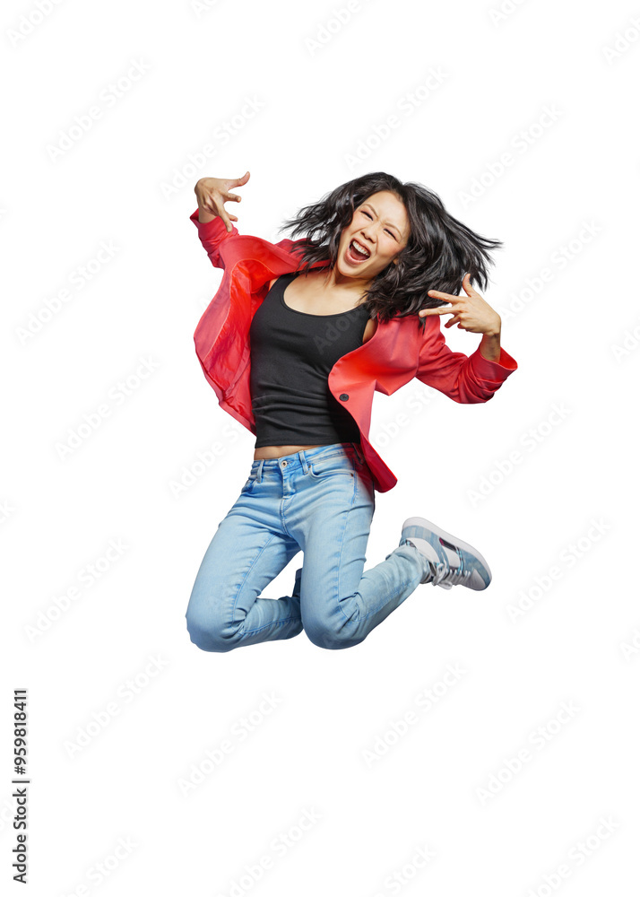 Excited happy pretty girl in casual jeans clothes high jump isolated on free png background