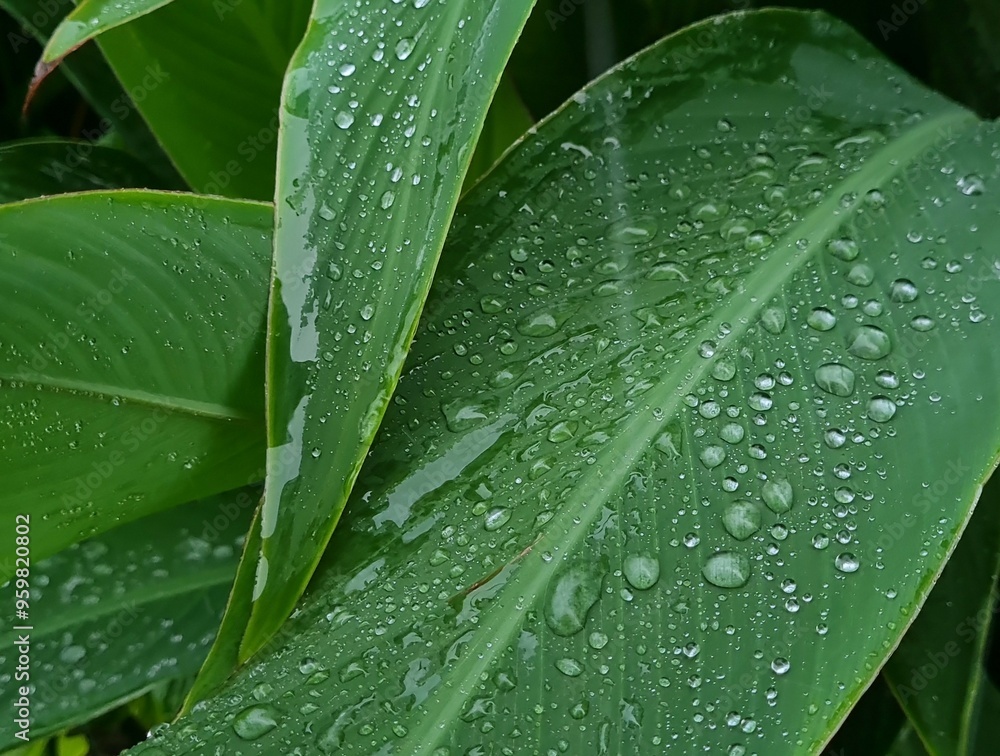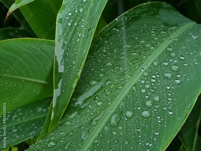 Green leaves with large raindrops, water flowing down the stems