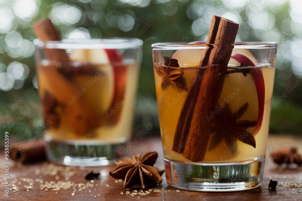 Christmas mulled apple cider with spices cinnamon, cloves, anise and honey on rustic table, traditional drink on winter holiday, magical evening light, selective focus