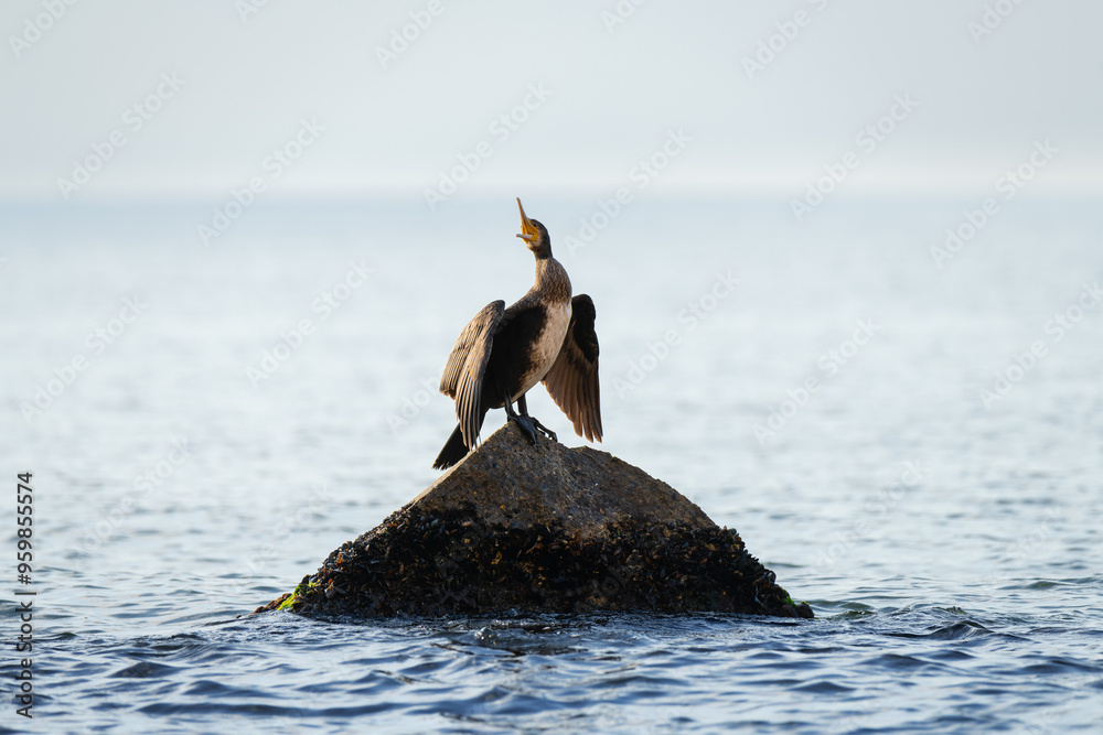 Great cormorant standing on the stone and drying wings on the blue sea background