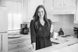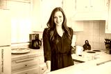 Modern living woman with coffee tea cup in kitchen color theme red burgundy white space housewife home wife