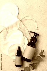 Reusable cotton pads for makeup removal and brown glass cosmetic bottles