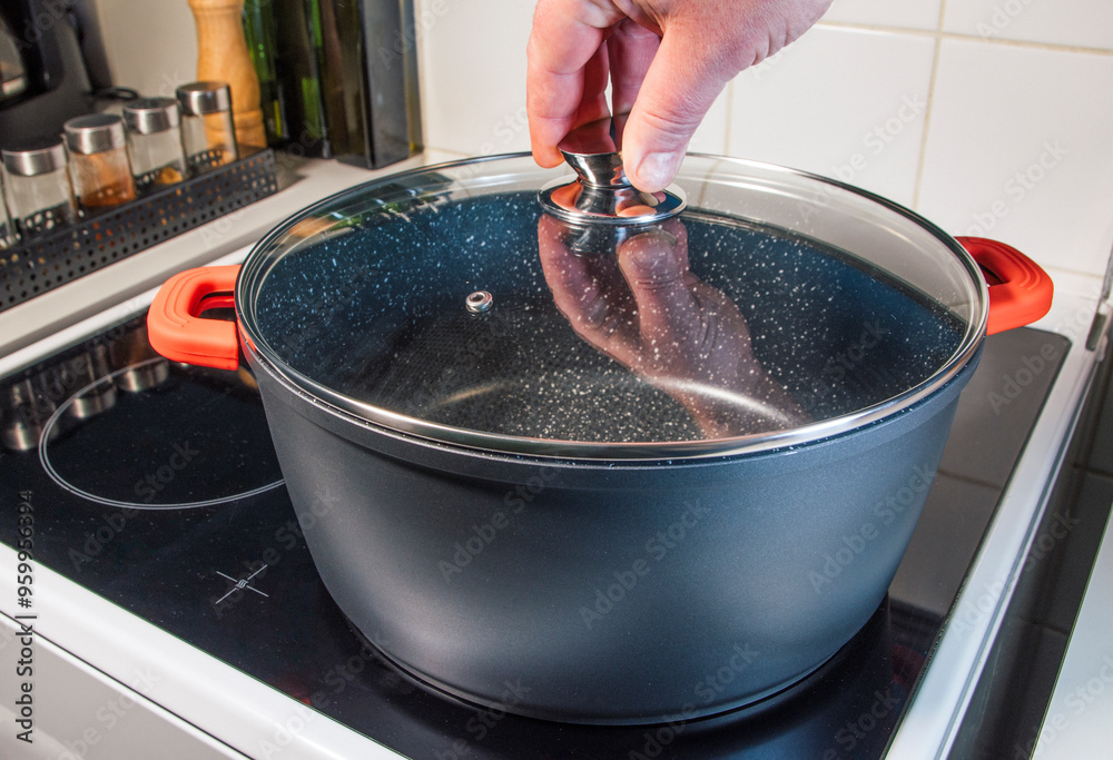 Hand opens the lid of a Teflon cauldron with ceramic coating for frying