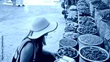 A young woman in a straw hat explores a traditional market in dubai, surrounded by colorful spices and textiles.