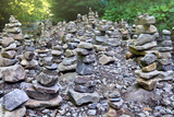 Stack of zen stones, natural pebble rocks stacked on top of each other in stream in a forest. Concept of harmony and balance